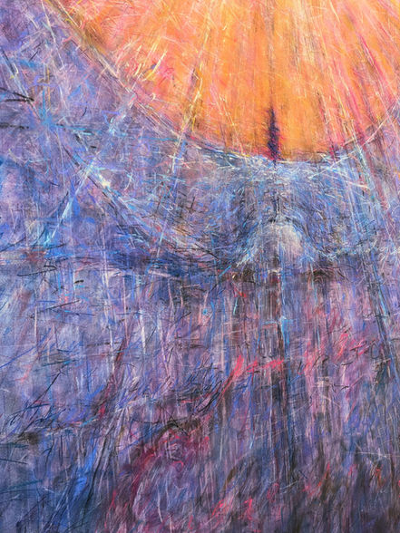 This work explores personal stories about self, love, and loss – and finding steadfastness in the lands and skies that stand with us. Recurring motifs in my practice are revisited in the work, including the orb, cruciform, textual marks, and ethereal figures, with a new radiant form emerging from above.